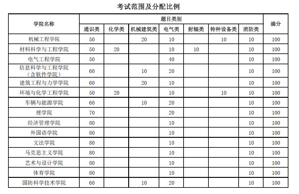 本次考试共涉及通识、化学、机械建筑、电气、辐射、特种设备和消防等七大类安全知识,各学院具体考试范围如下表。