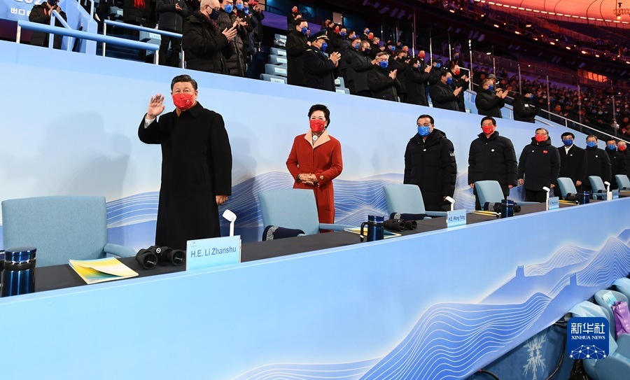 3月4日晚,北京2022年冬残奥会开幕式在国家体育场隆重举行。这是国家主席习近平同国际残奥委会主席帕森斯在主席台上向大家挥手致意。新华社记者 李学仁 摄